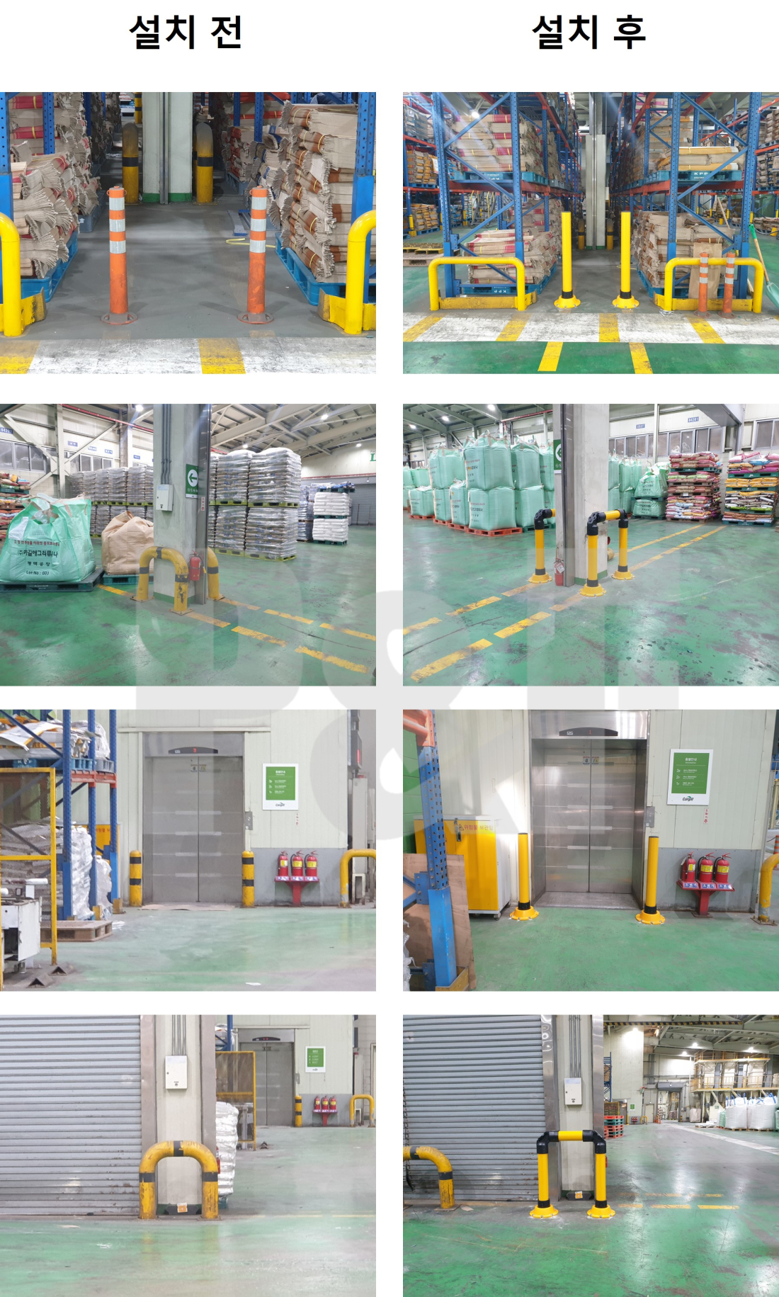 당사는 물류창고 내 안전이 취약한 기둥, 엘레베이터 등의 시설물 보호를 위해 기존 보호대보다 우수한 성능의 스윙텍터를 설치하였습니다.